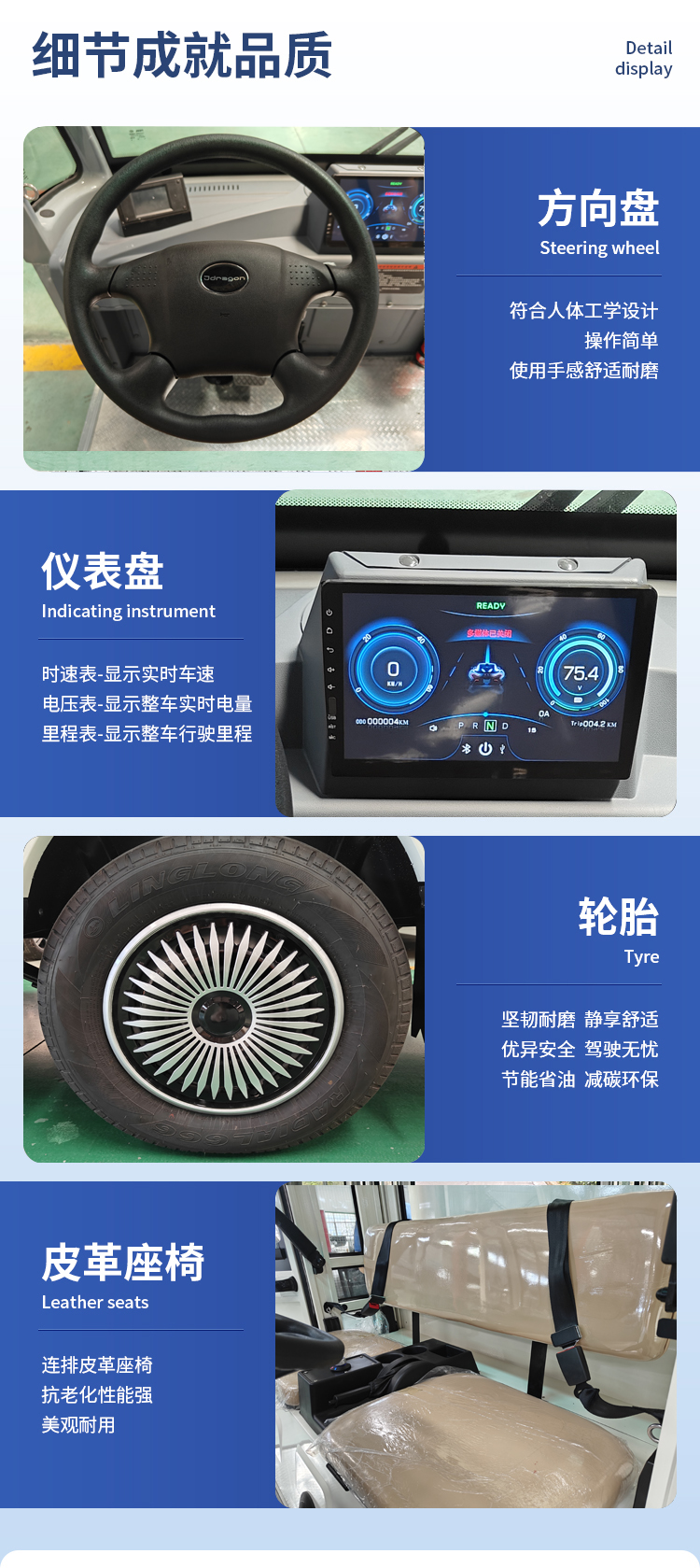 采用國際水平交流電控系統(tǒng),小轎車專用真空子午線高速輪胎,電子真空助力制動(可選),擁有國家質(zhì)量檢驗總局頒發(fā)的特種設(shè)備制造許可證,整車使用壽命更長久。